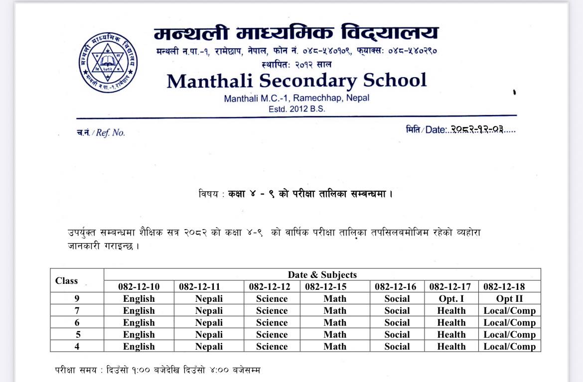 ЁЯЪА *Admission Open* & *Form Distribution Started* at _Manthali Secondary School_ for ECD тАУ Grade IX, Academic Year 2083! ЁЯОУЁЯУЪ Enroll from Baishakh 15 & give your child *Best Quality Education*, Smart Technology, Creative Learning, Dynamic Teamwork, Advanced Programs & School Bus facility. Choose us for your kidsтАЩ better future! ЁЯУН Manthali-1, Ramechhap | ЁЯУЮ 048-540109 / 540573 | 9864018002 | ЁЯМР schoolmanthali.edu.np #AdmissionOpen #FormDistribution #EnrollNow #QualityEducation #ManthaliSchool ЁЯЪНЁЯСзЁЯСжтЬи
